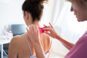 Woman applying soothing kinesiology tape on neck of client 15 december 2025 ← Wat houdt oefentherapie in?